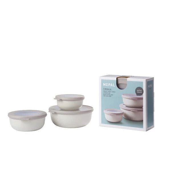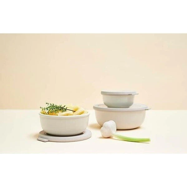 Das Schüssel-Set in Nordic White besteht aus drei flachen Schüsseln mit 350 ml, 750 ml und 1250 ml Fassungsvermögen.