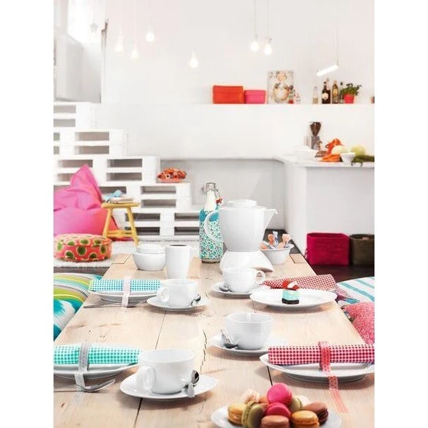 Der Frühstücksteller Sanssouci von Rosenthal zeigt den üppigen Stil des Rokokos: Am Tellerrand entlang ranken sich Dekorelemente, die den Dekorationen des Potsdamer Schlosses nachempfunden sind. Mit seinen 21 cm Durchmesser passt der Frühstücksteller Sanssouci optimal für das Toast oder das Marmeladenbrot am Morgen. Er besteht aus Hartporzellan und ist daher sowohl für die Spülmaschine als auch für die Mikrowelle geeignet.